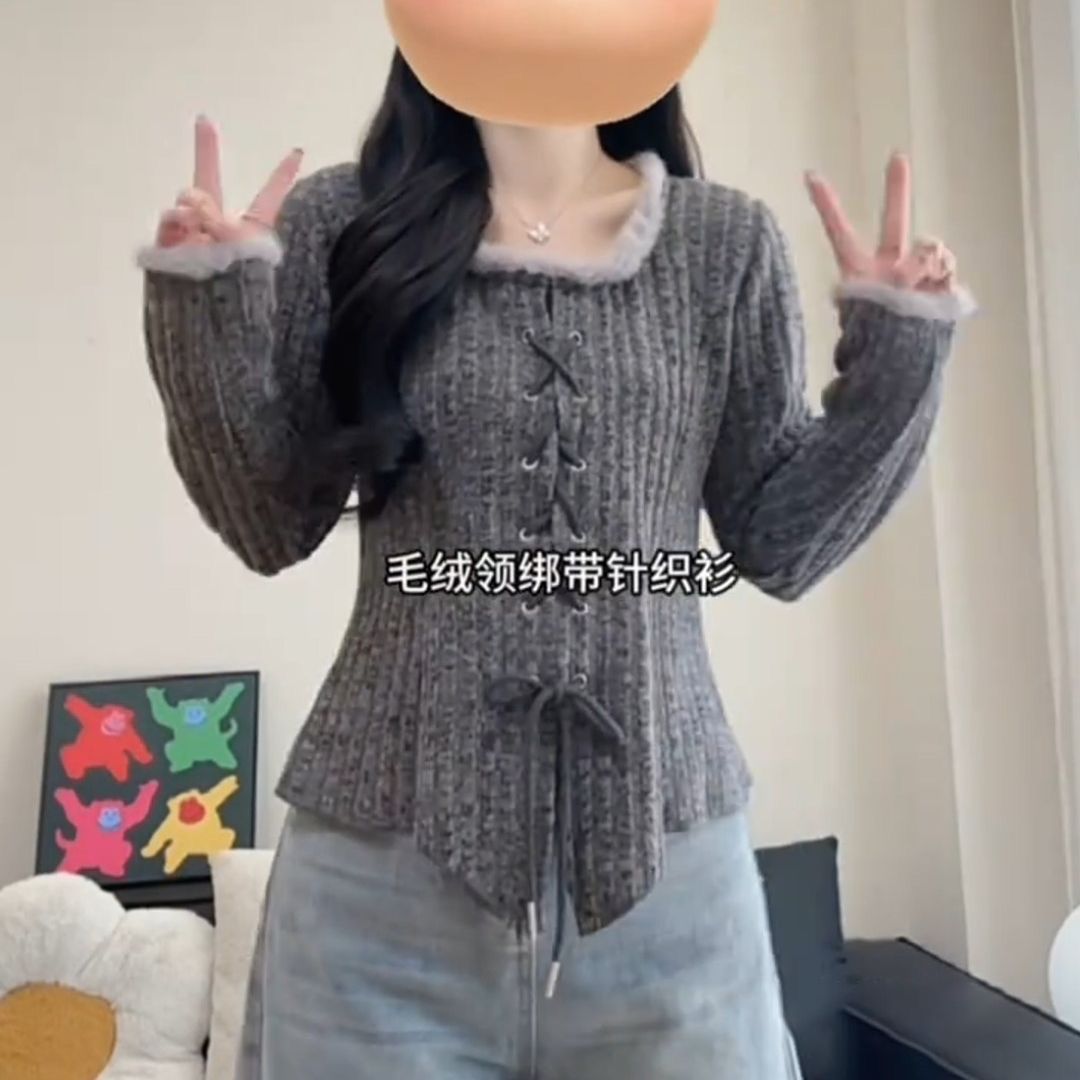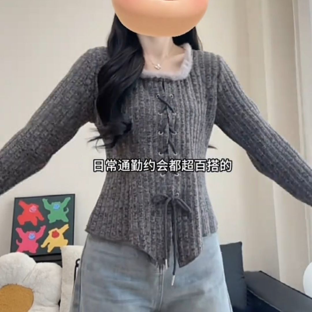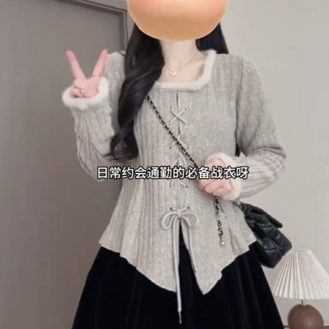 法式方领加绒内搭针织衫女冬季新款大码胖mm纯欲风辣妹上衣打底衫
